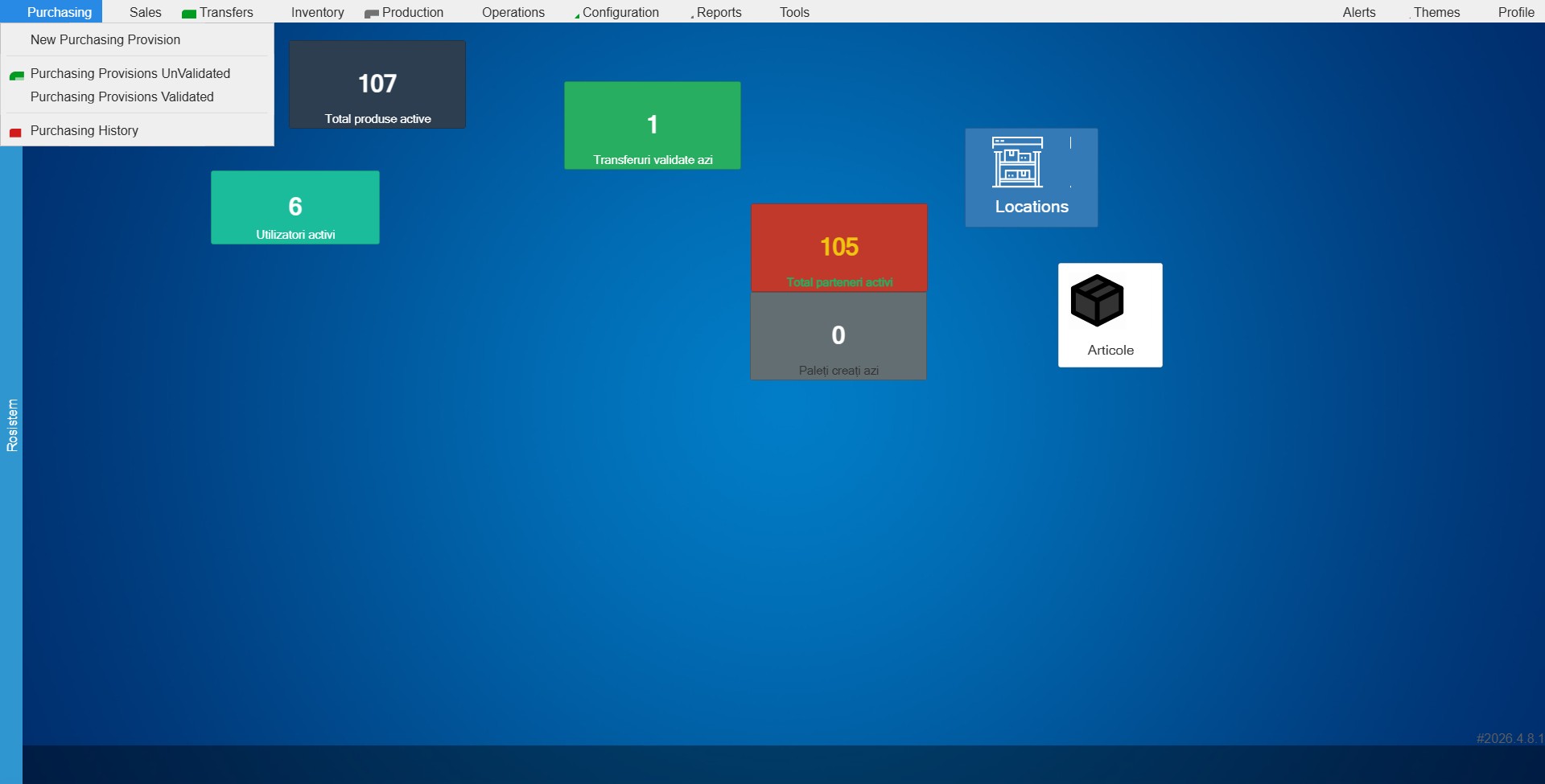 Acuratețe de stoc în timp real prin organizarea depozitului pe culoare, rafturi și locații, fiecare mișcare fiind capturată prin scanare cod de bare sau RFID. Recepția, stocarea, inventarul ciclic și transferurile inter-locație sunt înregistrate imediat, oferind supervizorilor o imagine live a depozitului. License-plating-ul leagă paletul fizic de conținutul său logic, astfel încât o singură scanare mută o unitate întreagă. Sunt suportate locațiile mixte, rotația FIFO/FEFO și pragurile min/max cu replenishment automat către ERP.